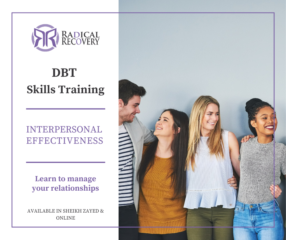 DBT skills training is a weekly group, run like a class, which teaches skills across four main topics: mindfulness, interpersonal effectiveness, emotion regulation, and distress tolerance skills. Clients are required to complete homework assignments in which they practice the skills taught during the weekly lesson.